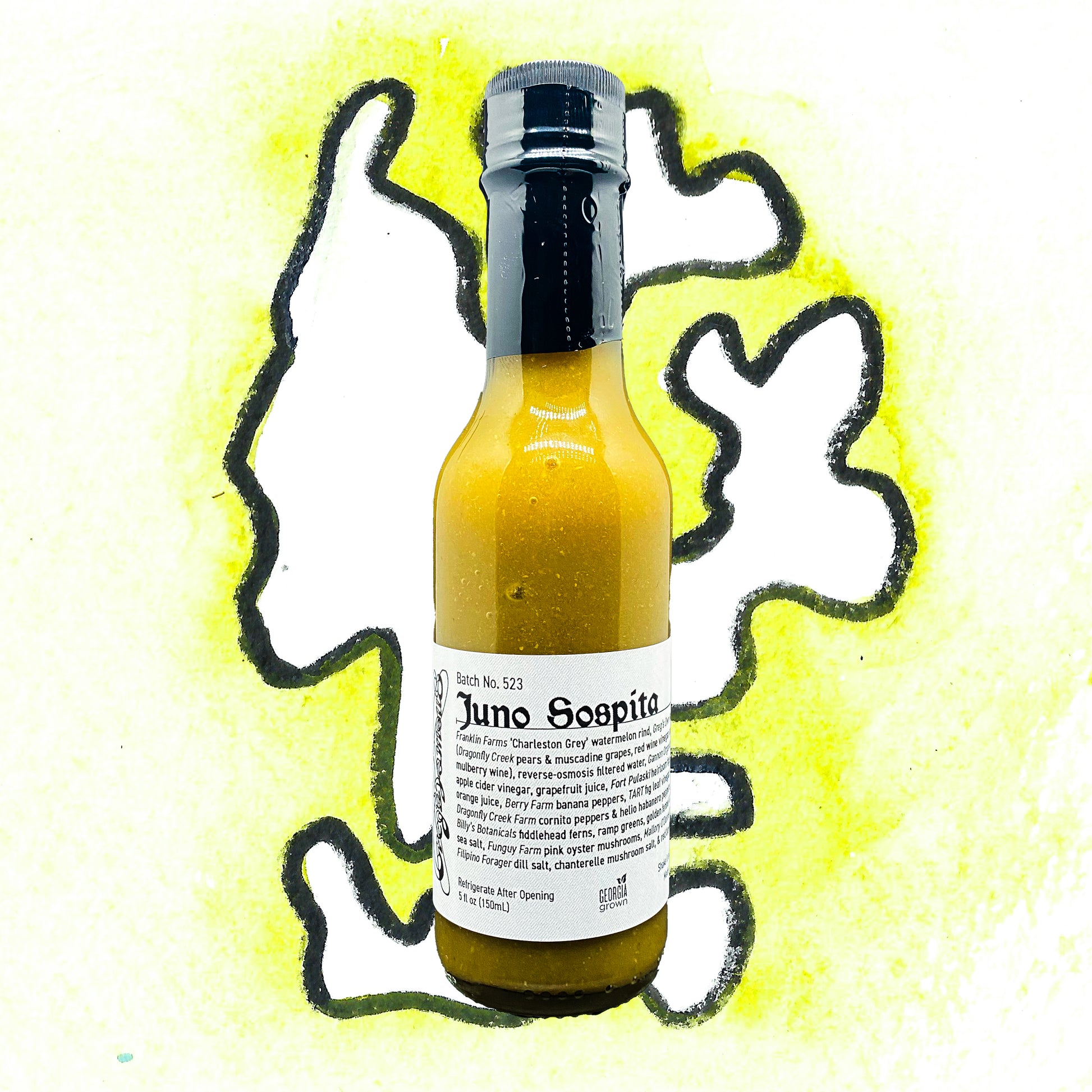 Franklin Farms ‘Charleston Grey’ watermelon rind, Greg’s Own Harvest Vinegar (Dragonfly Creek pears & muscadine grapes, red wine vinegar, apple cider vinegar, mulberry wine), reverse-osmosis filtered water, Gannon Organics serrano & jalapeno peppers, apple cider vinegar, grapefruit juice, Fort Pulaski heirloom figs, orange juice, Berry Farm banana peppers, TART fig leaf vinegar, Dragonfly Creek Farm cornito peppers & helio habanero peppers, Billy’s Botanicals fiddlehead ferns, ramp greens, golden fennel & horseradish greens, sea salt, Funguy Farm pink oyster mushrooms, Mallory O’Donnell’s elderberry capers, Filipino Forager dill salt, chanterelle mushroom salt, & red bay leaf, Wild Light swamp honey